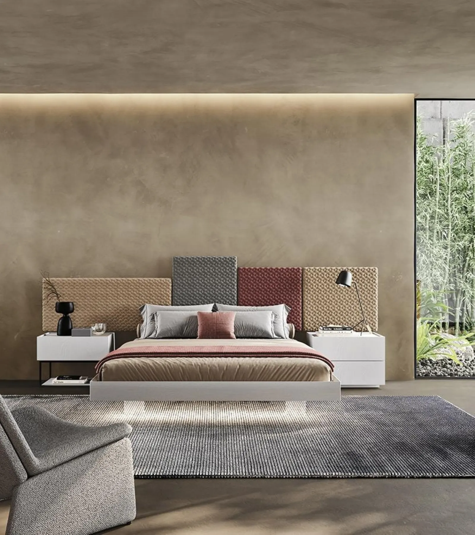 Il Letto Tetris con testiera boiserie di Mobilgam ricrea uno spazio intimo e confortevole in ogni camera da letto, assicurandoti il sonno più profondo e uno stile unico. Durante la scelta della giusta tipologia di letto, valuta con attenzione le sue misure, le finiture, la forma e il suo stile rispetto al resto dell'arredo. I Letti matrimoniali sommier della marca, specialista nella realizzazione di Arredamento Casa per la zona del riposo, sono pensati per essere abbinati a mobili e complementi di ogni tipo, come armadi e comò, abat jour e piantane. Scegli tonalità e finiture e realizza il tuo concept d’arredo nella camera da letto, progettandola proprio come l'avevi immaginata. Se vuoi una soluzione in tessuto, il modello presente in foto è contraddistinto da materiali pregiati e forme decise, che invitano a trascorrere un riposo sereno e rigenerante.